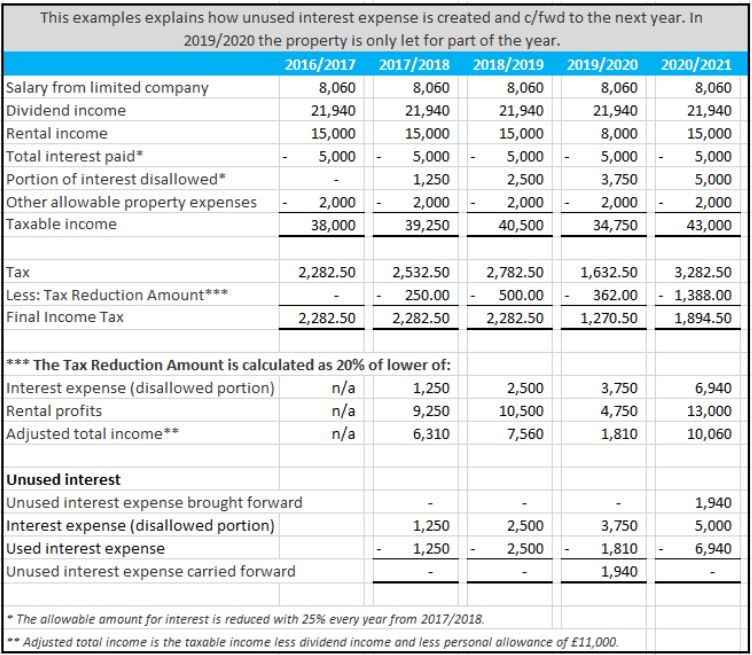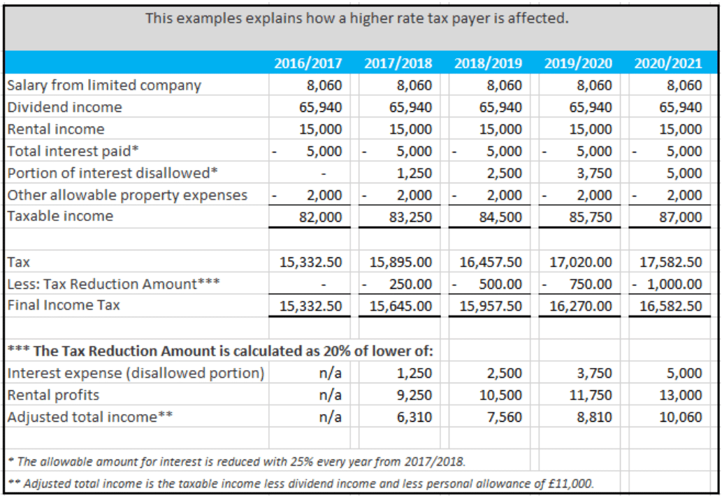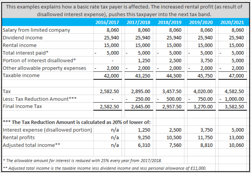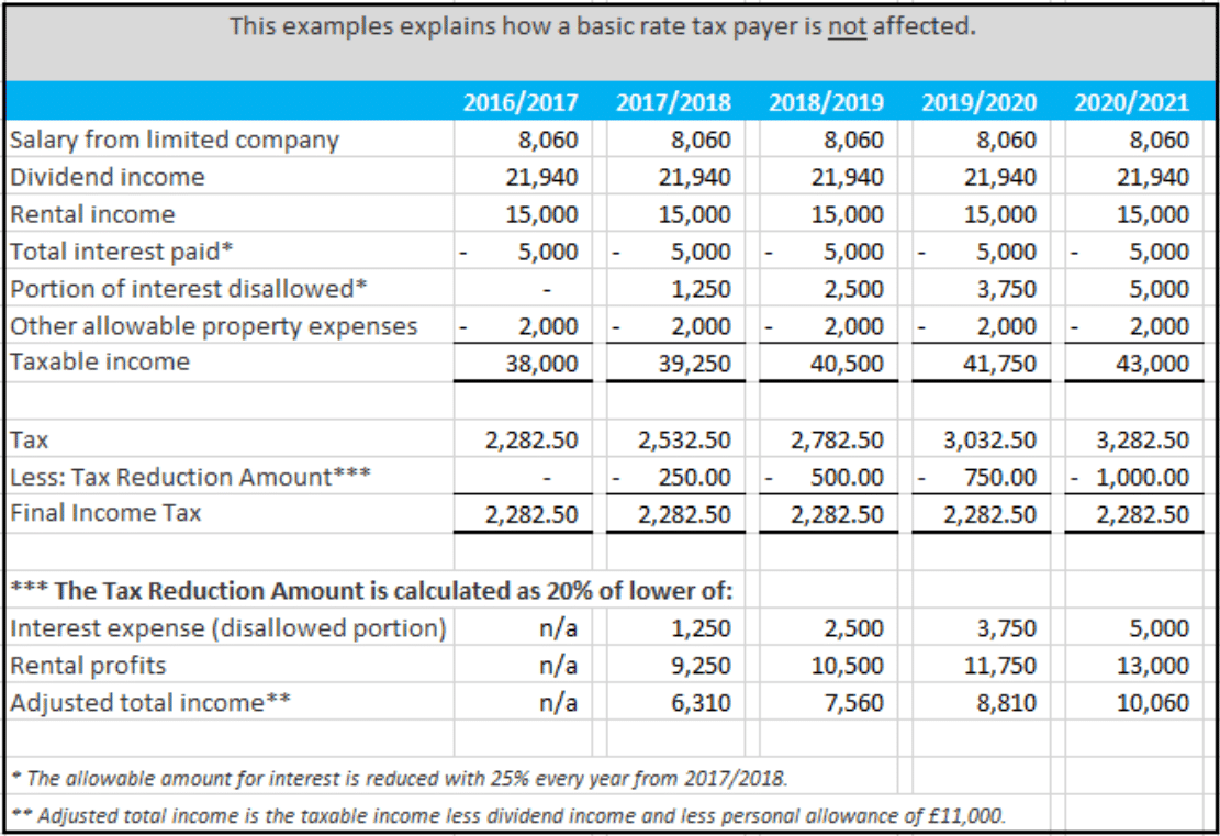From 6 April 2017 full interest expenses can no longer be deducted from rental income, a Tax Reduction Amount must be calculated instead. The tax liability of a basic-rate taxpayer could remain unchanged, if the new profit calculation does not push the basic-rate taxpayer into a higher tax band.